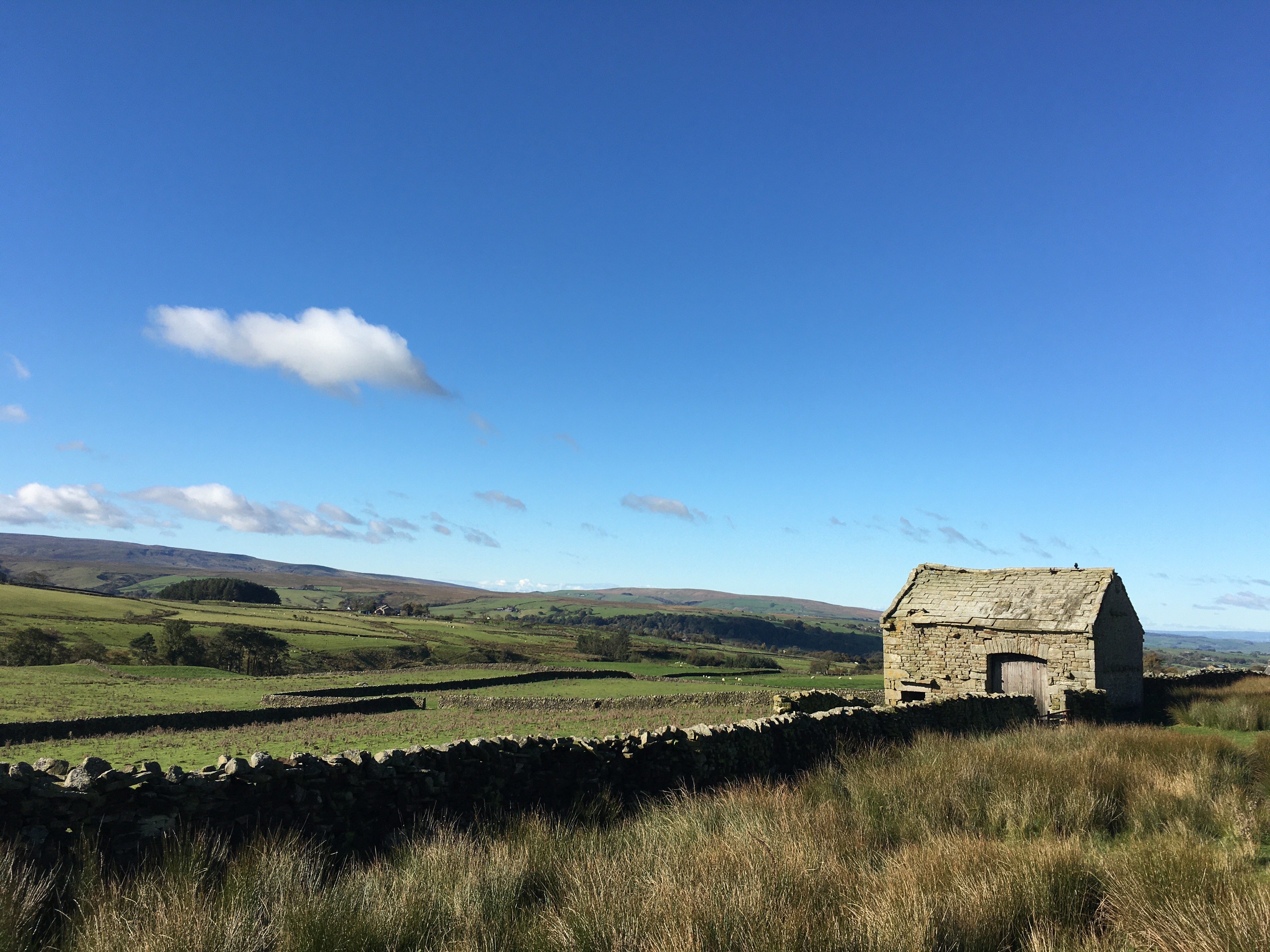 The road goes up and up. The steepest part is on Silly Lane which always makes me chuckle as I go past the sign, swiftly followed by gasping of breath as the hill kicks in. When you get near to the top however it begins to open up onto wide expanses of farmland with the moors rising behind them.